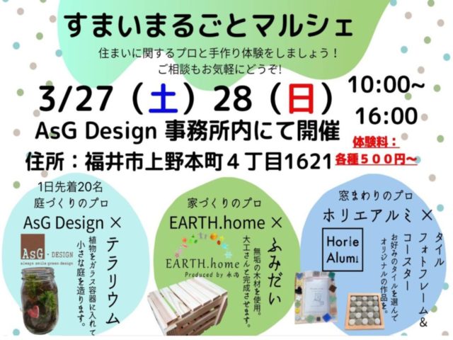 住まいに関するプロ3社が集結!すまいまるごとマルシェ 開催のお知らせ3月27日(土)・28日(日)の両日、弊社AsG・DESIGN敷地内にて 家づくりのプロ(EARTH.home)・庭づくりのプロ(AsG・DESIGN)・アルミサッシ、窓のプロ(ホリエアルミ)の住...